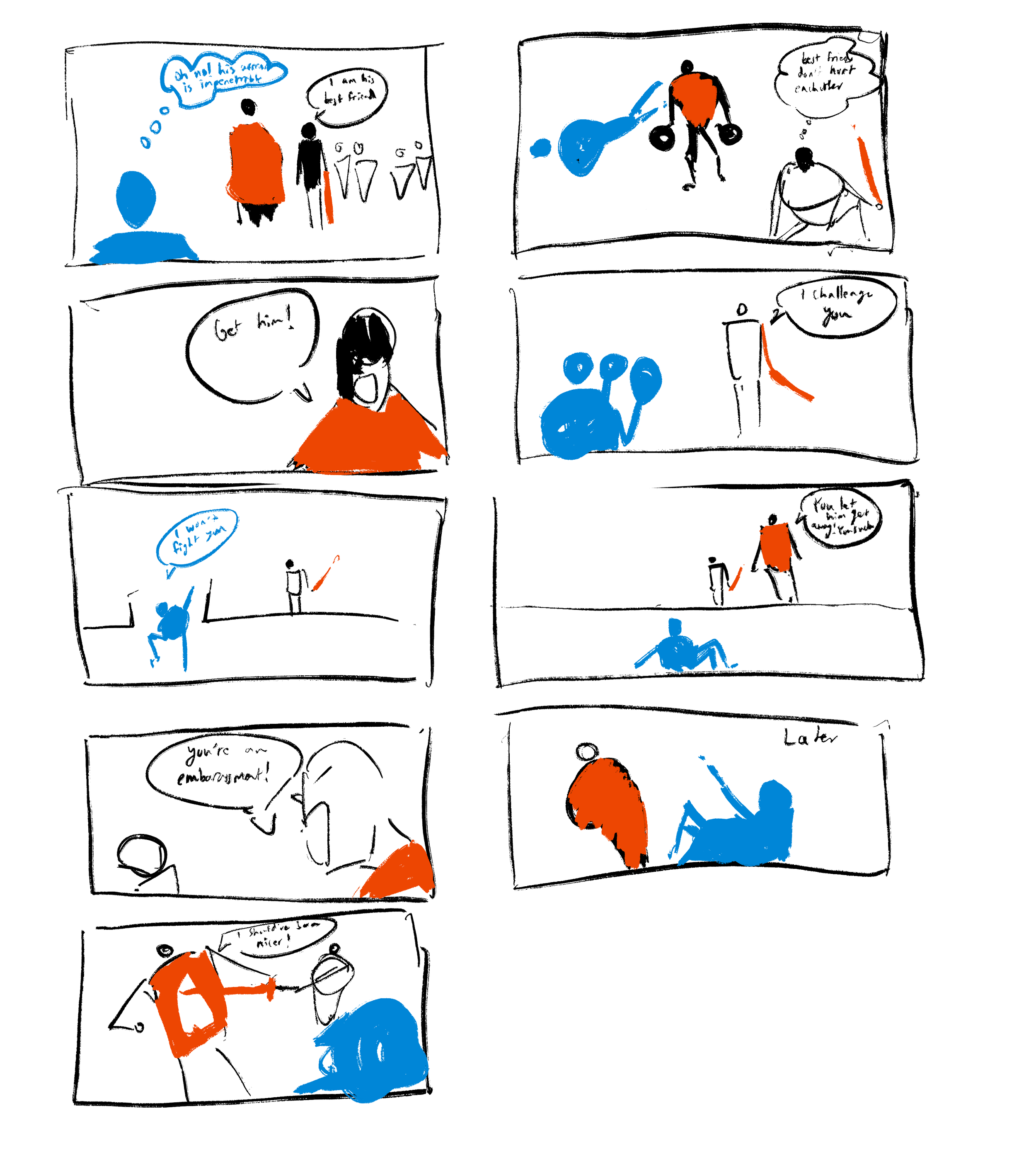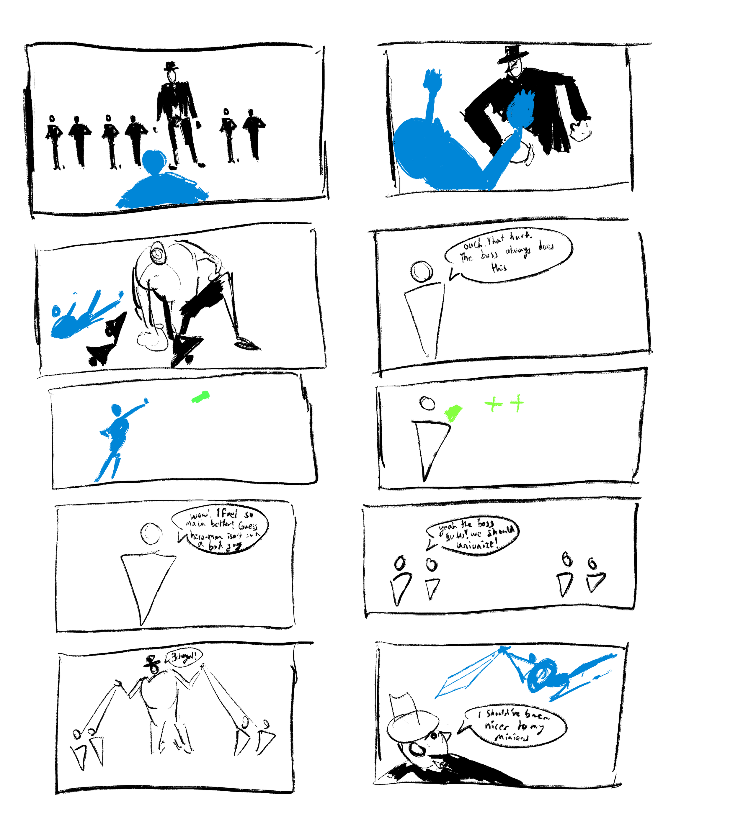 I created this prototype based on the idea of a “workplace” where the Boss is a literal boss and the minions are his employees. The Boss is invulnerable except for when he gets hit by bullets fired by his minions. Based on how you treat the minions, by giving them health or getting their boss to hit them you can turn them to your side, or lose their allegiance.