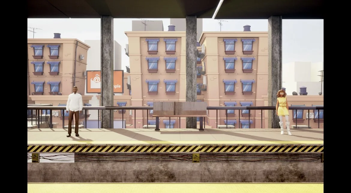 I found assets for a train platform, including a model and subway columns, as well as assets for stylized buildings, giving the impression of a city outside the platform. I then laid out the set, and started blocking out the key shots of the scenes based on the storyboard, testing out various combinations of composition, character staging, and playing around with lighting of different colors and placement.