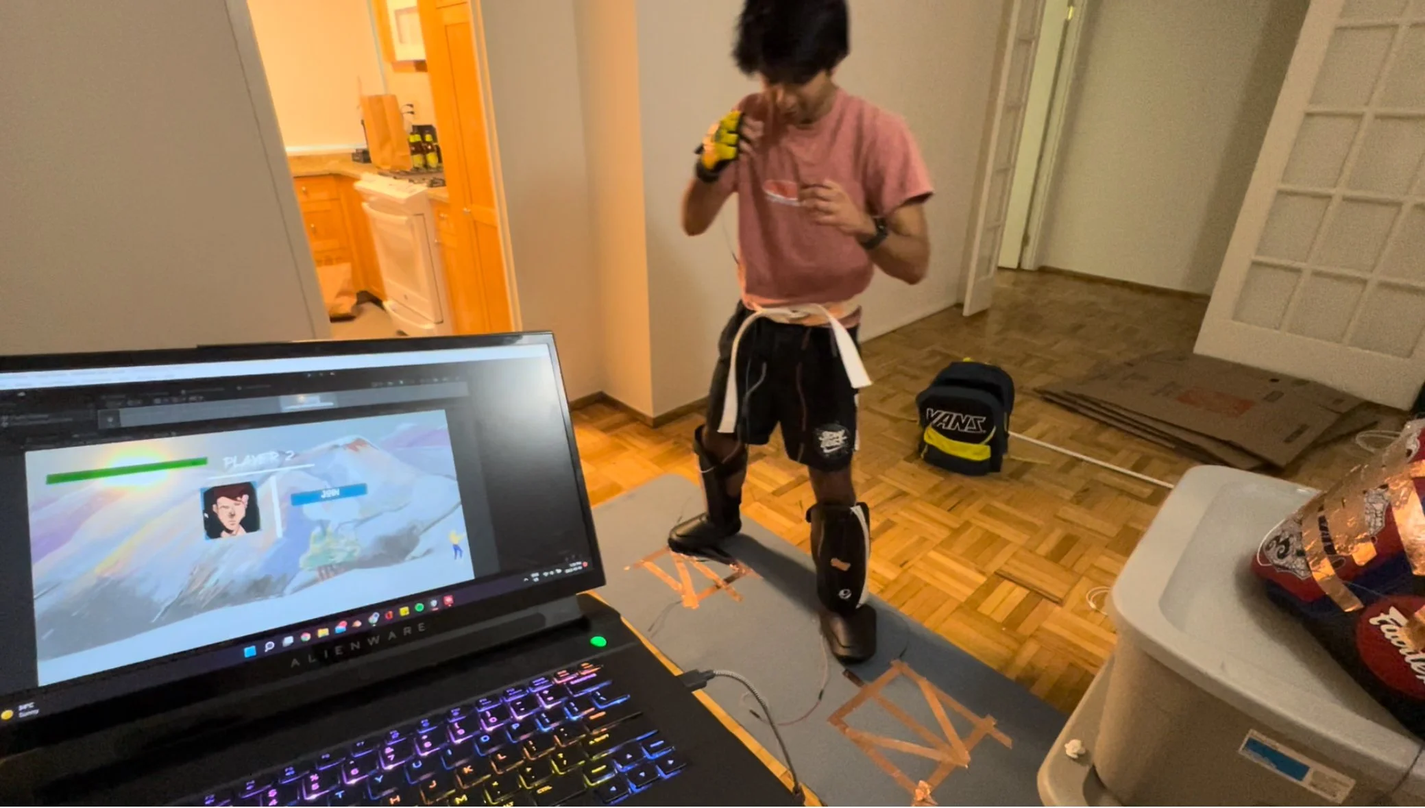 I made a Karate belt, the main hub of all the wires, connected to both MMA gloves and Shin Guards, each representing two types of attacks, heavy and light. This was also connected to conductive tape located at the soles of the Shin Guards, keeping track of where the player was moving. The whole Arduino was connected to a Belly Bad that would register punches or kicks depending on the move the player used. It was also connected to forward/backwards arrows on a Yoga mat that determined the player’s movement!